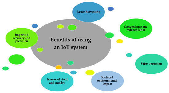 The benefits of using an IoT system for Chinese cabbage production include faster harvesting, convenience and reduced labor, safer operation, reduced environmental impact, increased yield and quality, and improved accuracy and precision (