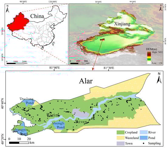 The study area was the Alar reclamation (Figure 1) (80°30′–81°58′ E and 40°22′–40°57′ N), located in the southern Tianshan Mountains of Central Asia and the northern margin of the Taklimakan desert, within the upper reaches of the Tarim River. The Alar reclamation contains ten regiments (towns) and villages, with an alluvial plain with an average elevation of 1012 m and gentle slopes from northwest to southeast [59]. The region has a typical continental arid desert climate with an average annual temperature of 10.7 °C. Rainfall is low but evaporation is high. The average annual precipitation is less than 50 mm, but the annual potential evaporation exceeds 2000 mm in this area [60]. The study area is a county-level city governed by the Xinjiang Production and Construction Corps, which includes 10 regiments (towns) and townships, encompassing a total area of approximately 3900 km2. Over the past three decades, farmland has been the main land use type, cotton is the main crop, and it is the main irrigated agricultural, forestry, and pastoral area in the southern Xinjiang region, as well as an important national-level cotton production base.