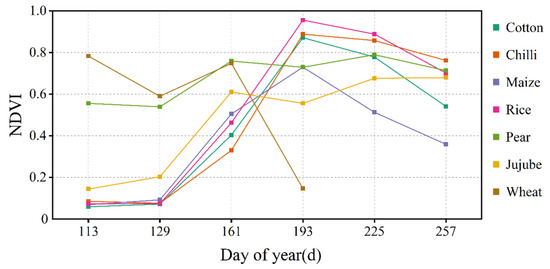 The NDVI data from March to September 2023 were used as the data source, and the average NDVI value of each type of sample point was taken as its representative NDVI value to establish the time series curve of the main crops as shown in the figure (Figure 3). Winter wheat grows vigorously from March to April in the Alar reclamation area, and the NDVI values are much higher than those of other crops, which is the best time to separate winter wheat from other crops. Rice irrigation started from late April to late May, and the irrigation of paddy fields had basically ended on June 10, at which time the NDVI value of paddy fields was much smaller than that of other crops, and it was the best period to separate rice from other crops. Corn crops in the Alar reclamation area entered the filling period from late July to early August, when the NDVI value was much higher than that of the other crops, and it was an important period to categorize corn and other crops. Cotton crop ushers in the first balling stage in August, which is the most intense period of cotton reproduction, growth, and development, and its plant growth is excellent for reaching the highest peak, so it is also the main period for distinguishing cotton from other crops.