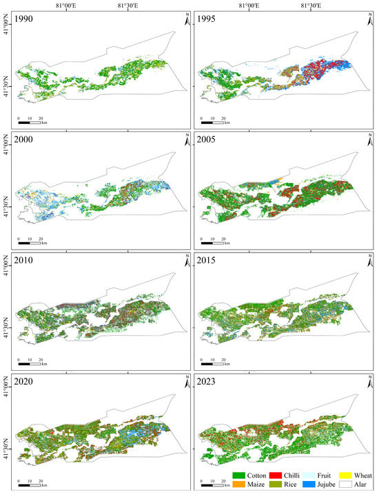 The CART was used to collect information and results on CPS changes in the Alar reclamation from 1990 to 2023, and the extracted data were mapped using ArcMap 10.2 to show the spatial distribution of different crops in the study area (Figure 4).