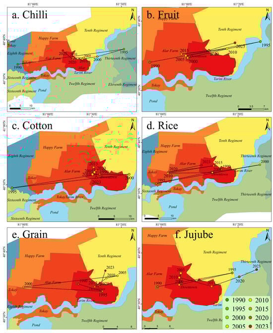 Figure 5. Crop centroid migration map: (a) chili, (b) fruit, (c) cotton, (d) rice, (e) grain, (f) jujube.
