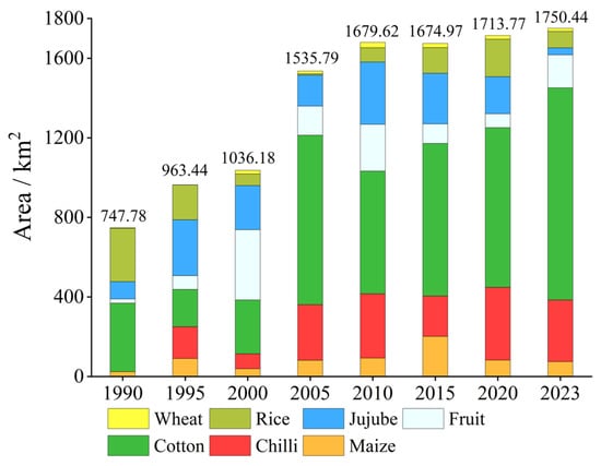 Changes in the cultivated area of different crops in the Alar reclamation during 1990–2023 are shown in Figure 6. During the period of 33a, the cultivated area in the Alar reclamation was increasing, and the usable wasteland area was gradually reclaimed as cultivated land. The results show that the cultivated area in the Alar reclamation has grown from 747.78 km2 in 1990 to 1750.44 km2 in 2023, with an average annual growth rate of 30.38 km2/a. According to the growth rate change of the cultivated area, the changes of the cultivated area in the Alar reclamation are divided into two stages: the first stage is the rapid growth period from 1990 to 2005, when the cultivated area grew from 747.78 km2 to 1535.79 km2 with an average growth rate of 52.53 km2/a. During this period, the cultivated land area in the Alar reclamation expanded rapidly, and the wasteland was transformed into usable cultivated land over a large area with an influx of a working population. The second stage is the stabilization period from 2005 to 2023, where the cultivated land area changed from 1539.79 km2 in 2005 to 1750.44 km2 in 2023, with an average growth rate of 11.70 km2/a. During this period, most of the available wasteland in the Alar reclamation was developed into cultivated land in the earlier years. At the same time, the change of related direction motivated pioneering movement and the growth of cultivated land area slowed down.