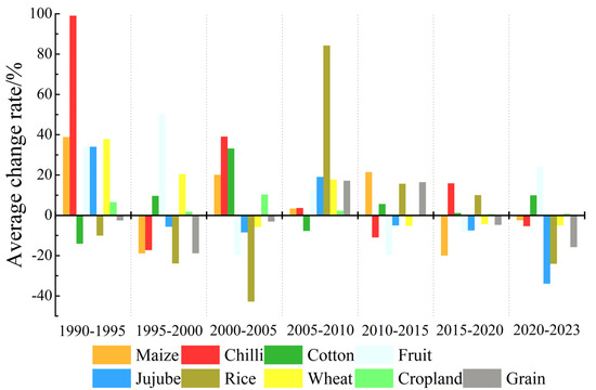 The average annual growth rates of maize, chili, cotton, rice, wheat, fruit trees (apple and pear trees), grain crops (maize + wheat), and wasteland area in the Alar reclamation for the period 1990–2023 are shown in Figure 7. The rate of change in the area of major crops in different periods was different. The most significant change was for rice, mainly because rice in the Alar reclamation is grown for the purpose of salt pressure on the cotton plantation. The demand for different areas of salt pressure in each period of time made the rice plantation area change more drastically. The Alar reclamation’s cotton plantation salt pressure behavior is concentrated in one year, and the rest of the year does not require salt pressure to continue growing cotton. In the case of cotton in the Alar reclamation, the highest growth rate was recorded in the period of 2000–2005. The average annual growth rate of the cultivated area was also significantly higher in the same period.