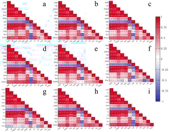 Figure 8. Variable correlation heat maps of the driving force of farmland change: (a) chili, (b) maize, (c) wheat, (d) cotton, (e) jujube, (f) rice, (g) fruit, (h) grain, (i) crop.