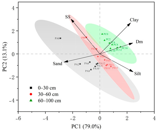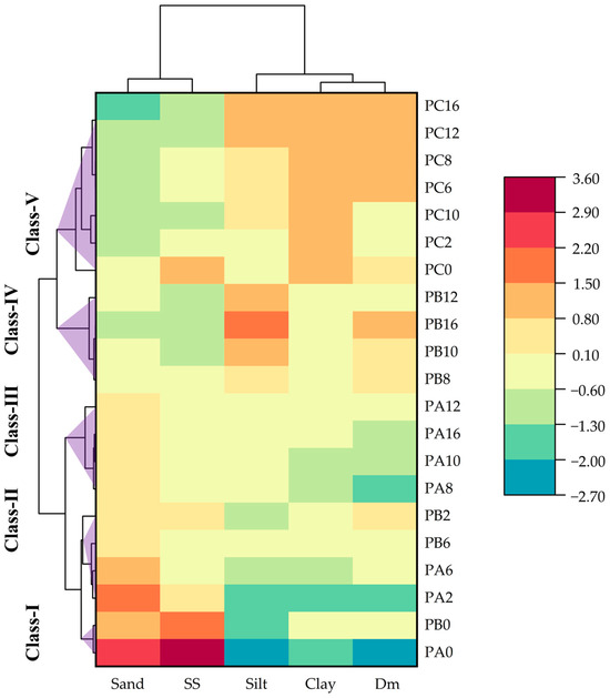 The fifth group (Class V) presents soil data from the 60–100 cm soil layer, ranging from PC0 to PC16. This is because the 60–100 cm soil layer was relatively less affected by MDI, resulting in less pronounced changes compared to the 0–60 cm soil layer. Notably, variations in this deeper layer were primarily affected by finer particles like silt and clay (Figure 5). The phenomenon can be elucidated by the downward movement facilitated by MDI, which facilitates the transportation of finer particles and solutes towards deeper soil layers. The increased presence of fine particles promoted the development of clay and loam textures, facilitating the formation of soil aggregates and enhancing water-holding capacity.