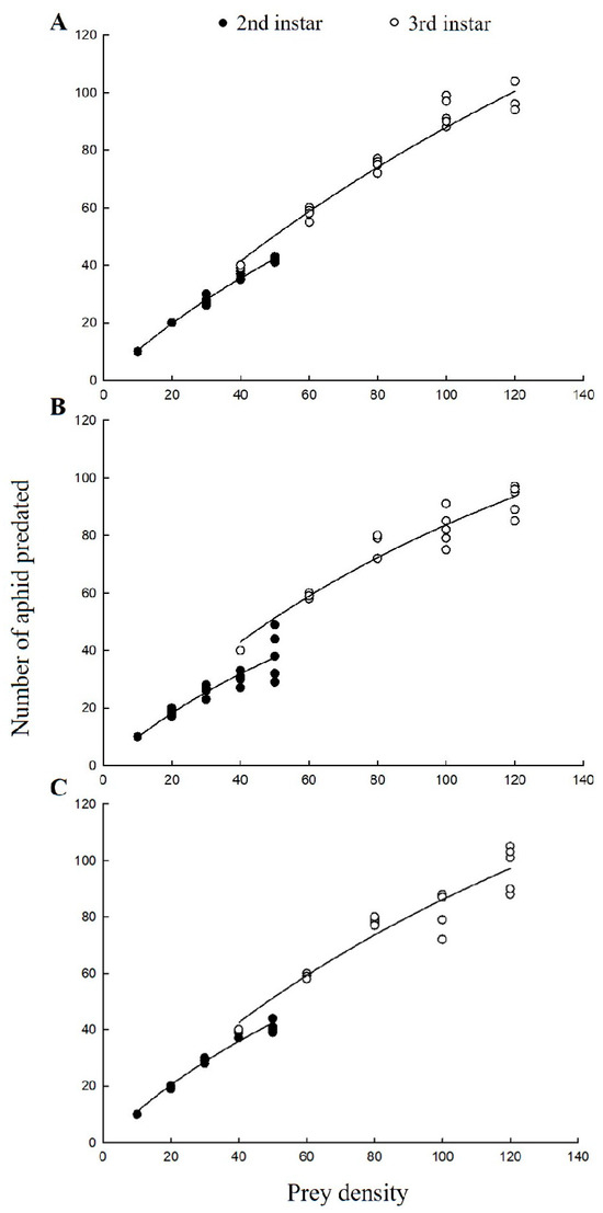 A response in which a predator’s predation rate of prey varies with the density of the prey is called the predatory functional response and is affected by various factors such as the predator’s physiological state, prey species, and the temperature and humidity of the test environment [27,28,29]. In this study, an artificial climate chamber was used to precisely control the temperature and humidity of the test environment, thereby eliminating errors caused by the test environment. According to the trend of predation rate and prey density, predation functional responses are traditionally divided into three types (Holling’s types I, II, and III) [30]. All three types are present in hoverflies. For example, Singh and Mishra found a type I functional response for Ischiodon scutellaris preying on Rhopalosiphum maidis [31]. Holling’s type II has been reported for Episyrphus balteatus and Scaeva albomaculata feeding on M. persicae [32]. Sobhani et al. reported a type III functional response of the third instar of E.balteatus on Aphis gossypii [33]. In this study, we found the 2nd and 3rd instar E. corollae larvae preying on these three wheat aphid species all exhibited Holling’s type II functional response. The 1/Th of 3rd instar E. corollae on R. padi was 333.33, and the 1/Th of 3rd instar Episyrphus balteatus was 163.93 [34], which suggests that the E. corollae probably have good biocontrol potential for R. padi. However, we only studied the predation of aphids within 24 h of 2nd and 3rd instar E. corollae larvae, and there is a lack of information on the predation of the whole larval stage, which needs to be improved for a comprehensive understanding of its biocontrol potential. The 1/Th of the 3rd instar E. corollae larvae for these three wheat aphid species was higher than that of the 2nd instar in this study, which is a logical reflection of their larger size and the additional need for nutrients during their subsequent non-feeding pupal stage.