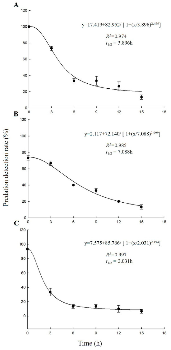 The multiplex PCR system had good specificity and effectiveness for the detection of these three species of wheat aphids (Figure S1). The predation detection rate-time curves of R. padi (y = 17.419 + 82.952)/[1 + (x/3.896)2.479], R2 = 0.974, F = 24.788, p = 0.0390), S. graminum (y = 2.117 + 72.140)/[1 + (x/7.088)2.099], R2 = 0.985, F = 43.676, p = 0.0225) and S. miscanthi (y = 7.575 + 85.766)/[1 + (x/2.031)2.194], R2 = 0.997, F = 270.548, p = 0.0037) in E. corollae larvae exhibited a declining trend. There was a significant difference in the predation detection rate-time curves of the three species of wheat aphids in the 3rd instar E. corollae larvae (χ2 = 9.288, df = 2, p = 0.01). The t1/2 values of R. padi, S. graminum, and S. miscanthi in the 3rd instar E. corollae larvae were 3.896, 7.088, and 2.031 h, respectively (Figure 3). The predation detection rate-time curves of S. miscanthi decreased by 80.00% from 0 to 6 h, indicating that the degradation of S. miscanthi in E. corollae was rapid during this period. The predation detection rate-time curves of S. graminum decreased slowly by 33.33% from 0 to 6 h. At 6–15 h, the predation detection rate-time curves of R. padi, S. graminum, and S. miscanthi decreased flatly by 20.00%, 26.77%, and 6.67%, respectively.