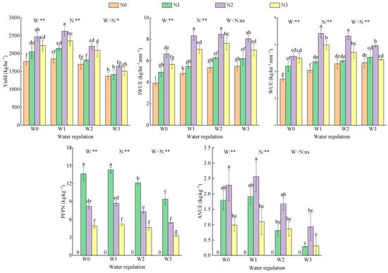 | Treatment | Irrigation Amount | Nitrogen Application Rate | Total Sugars | Polysac-Charides | Amino Acids | Proteins | Fats | Yield | IWUE | WUE | PFPN | ANUE | Net Income |