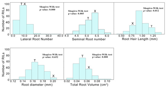 The frequency distribution histograms of lateral root number (LRN), seminal root number (SRN), root hair length (RHL), root diameter (RD), and total root volume (TRV) for the TAA10 (T) × XX329 (X) recombinant inbred population. p < 0.05 indicates a significant departure from the normal distribution (Shapiro-Wilk test).