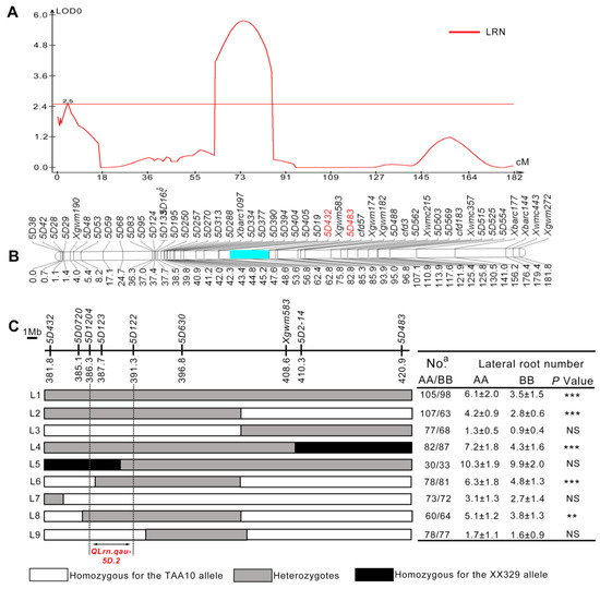 Residual heterozygous line (RHL) is an efficient tool for QTL fine-mapping without extensive backcrossing [46,47]. Fortunately, we successfully identified a RHL from the RIL population that carries a heterozygous segment in the target region of QLrn.qau-5D.2. Hence, we chose to focus on fine mapping the major QTL QLrn.qau-5D.2. The confidence interval of this QTL was determined to be between marker 5D432 and 5D483 (Figure 2A,B). To fine mapping QLrn.qau-5D.2, six new polymorphic InDel markers between TAA10 and XX329 were developed to genotype the segregating populations the segregating progenies of RHL (Table S2). Based on genotype of these markers, nine sets of NILs with overlapping recombinant segments were developed (L1–L9) (Figure 2C). The phenotyping analysis on LRN was applied among these homozygous non-recombinant lines. In the progeny test, NILTAA10 (with TAA10 allele) exhibited a significantly larger lateral root number than that of NILXX329 (with XX329 allele) within the populations L1, L2, L4, L6 and L8 (p < 0.01), while no significant differences were observed between NILTAA10 and NILXX329 within the populations L3, L5, L7 and L9. Taken together, QLrn.qau-5D.2 was precisely mapped to an approximate 5.0 Mb interval flanked by markers of 5D1204 and 5D122, corresponding to the genomic region from 386.3 Mb to 391.3 Mb in the IWGSC RefSeq v1.1. (Figure 2C).