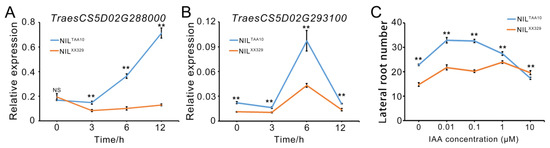 Effects of TraesCS5D02G288000 and TraesCS5D02G293100 in NILTAA10 and NILXX329 from one NIL pair L6 in response to IAA treatment. Expression analysis of TraesCS5D02G288000 (A) and TraesCS5D02G293100 (B) by RT-qPCR in roots of NILTAA10 and NILXX329 under 0.1 μM IAA treatment. TaActin was used as internal control. (C) Comparison of lateral root number between NILTAA10 and NILXX329 with different concentrations of IAA at the seedling stage. The IAA concentrations were 0, 0.01, 0.1, 1, and 10 μM, respectively. Values are indicated as mean ± SD. Statistical differences between NILTAA10 and NILXX329 are indicated by ** (p < 0.01). “NS” indicates no significance (Student’s t test).