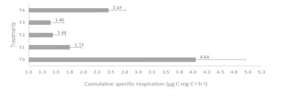 Cumulative specific respiration (µg C mg C−1 h−1) during seven days of incubation for each treatment. T0: B (bagasse); T1: B + E (vermicompost); T2: B + E + BC1; T3: B + E + BC2; T4: B + E + CM. Bagasse (B), earthworms (E), eucalyptus sawdust biochar (BC1), pig manure biochar (BC2), and carbonaceous material from poultry litter (CM).