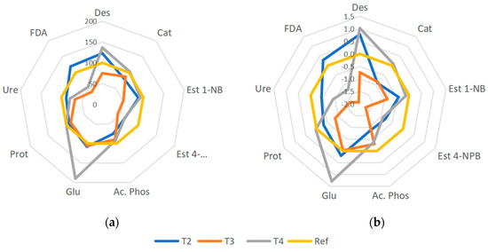 Global enzymatic response for vermicompost with added biochars through distribution of (a) T-SQI and (b) IBRv2 scores. Dehydrogenase (Des), catalase (Cat), esterase 1-NB (Est-1NB), esterase 4-NPB (Est-4NPB), acid phosphatase (Ac. Phos), β-glucosidase (Glu), protease (Prot), urease (Ure), and FDA. T1: B + E (vermicompost); T2: B + E + BC1; T3: B + E + BC2; T4: B + E + CM. Bagasse (B), earthworms (E), eucalyptus sawdust biochar (BC1), pig manure biochar (BC2), and carbonaceous material from poultry litter (CM).
