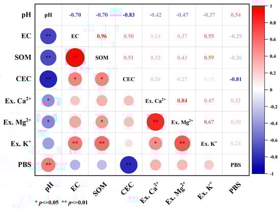 Pearson correlation analysis. CK, the control; O, organic fertilizer; M, montmorillonite; HA, humic acids; OM, organic fertilizer and montmorillonite; OHA, organic fertilizer and humic acid; MHA, montmorillonite and humic acid; OMHA, organic fertilizer, montmorillonite, and humic acid. Significance levels are denoted as follows: *: p < 0.05, **: p < 0.01. EC: soil conductivity; SOM: soil organic matter; CEC: cation exchange capacity; Ex. Ca2+: exchangeable calcium ions; Ex. Mg2+: exchangeable magnesium ions; Ex. K+: exchangeable potassium ions; PBS: percentage base saturation.