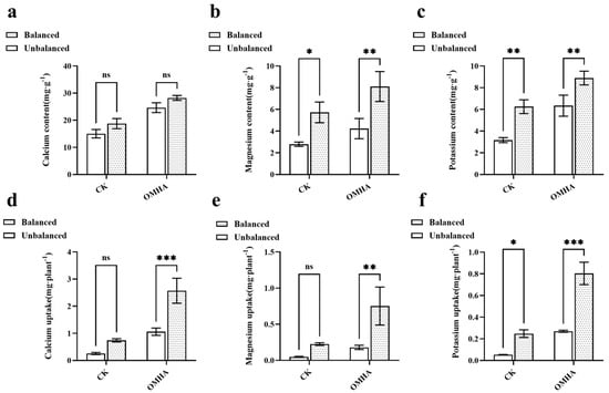 Concentration and uptake of Ca, Mg, and K in tomato plants under different balance treatments in CK and OMHA soils. (a) Calcium content in tomato seedlings in CK and OMHA soils; (b) Magnesium content in tomato seedlings in CK and OMHA soils; (c) Potassium content in tomato seedlings in CK and OMHA soils; (d) Calcium uptake in tomato seedlings in CK and OMHA soils; (e) Magnesium uptake in tomato seedlings in CK and OMHA soils; (f) Potassium uptake in tomato seedlings in CK and OMHA soils. Note: The data presented in this study are the means of three replications. A two-factor ANOVA was conducted, and Tukey’s test was used to determine significant differences between data points. Significance levels were set at p < 0.05 (*), p < 0.01 (**), p < 0.001 (***), ns: not significant.
