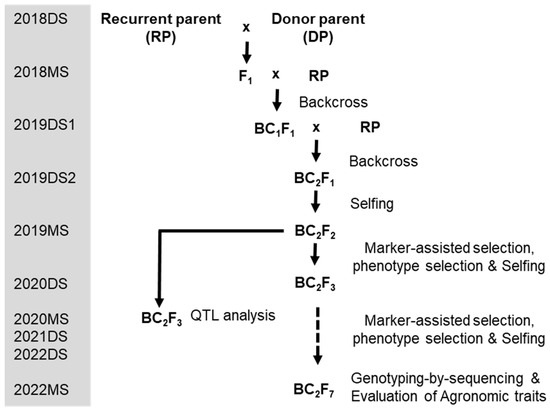 PSH was used as the female parent and crossed with ST12 to produce F1 plants with PSH cytoplasm at the DAR, Yezin, Naypyitaw, Myanmar, during the dry season of 2018 (2018DS). Because PSH has strong photoperiod sensitivity, a short-day treatment (8 h:16 h, light/dark) was applied to PSH to synchronize the flowering time with that of the donor parent in the dry season. These F1 plants were successively backcrossed twice with PSH as the male parent during the monsoon season in 2018 (2018MS) and DS in 2019 (2019DS) to generate BC2F1 lines. We performed backcrossing only twice because we wanted to incorporate useful genes without clarifying the genetic basis of favorable traits; the focus was on the observation and selection of individuals that expressed favorable traits. Twenty selected BC2F1 plants were advanced to the BC2F2 generation during the MS in 2019 (2019MS). Heading-date evaluation was continuously conducted from the F1 generation, and we observed the segregation of heading dates among the BC2F2 populations during 2019MS. To confirm that the photoperiod response of some early heading lines was screened again in the DS in 2020 (2020DS), only lines that could emerge during the dry season were selected for the development of photoperiod-insensitive lines for future generations. Heading-date evaluation was successively performed to ensure the uniformity of the heading date or photoperiod insensitivity, even under LD conditions. Marker-assisted selection was first started for F1 screening and carried out again from the BC2F2 generation derived from 20 BC2F1 plants and every later generation to ensure the presence of donor alleles of Gn1a and WFP using the DNA markers RM5423 and RM8098 for Gn1a and RM531 and RM264 for WFP. Simultaneously, phenotypic evaluation was initiated in the BC2F2 and later generations. BC2F2 lines homozygous for the donor alleles at Gn1a and WFP were selected and advanced to BC2F7 by 2022MS (Figure 2). In the BC2F7 generation, promising lines were genotyped using the GBS method and phenotypically evaluated.
