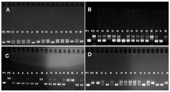 A, B, and H represent the genotype frequencies of homozygotes for the recurrent parent, homozygotes for the donor parent, and heterozygotes, respectively. Graphical genotypes were drawn using Chromosome Substitution Strain View (CSSView, http://shigen.nig.ac.jp/shigen/tool/tool.jsp (accessed on 4 September 2023)) software.