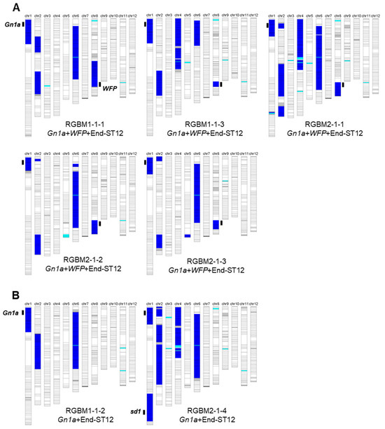 The 34 progenies from five populations carrying a combination of both Gn1a and WFP alleles from ST12, designated as Gn1a + WFP-ST12, had an RPGR of 79.8–89.8%. Among the five populations, the RGBM2-1-3 population had the highest RPGR of 89.8%, and the RGBM2-1-1 population had the lowest RPGR of 79.8%. The graphical genotypes of the lines with the highest RPGR in each population carrying Gn1a + WFP-ST12 are shown in Figure 4A. The 20 progenies from two populations carrying only Gn1a allele from ST12, designated as Gn1a-ST12, had an RPGR of 73.7–88.4%. Among those two populations, the RGBM1-1-2 population had a higher RPGR (88.4%) than RGBM2-1-4 (76.5%). Graphical genotypes of the lines with the highest RPGR in each population carrying Gn1a-ST12 are shown in Figure 4B.