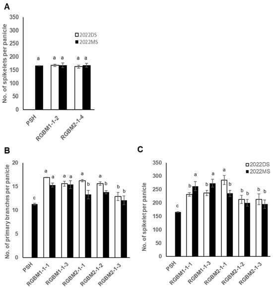 The effects of Gn1a on the spikelet number were evaluated during the DS and MS of 2022. On the PSH genetic background, both lines (RGBM1-1-2 and RGBM2-1-4) carrying Gn1a-ST12 showed no significant improvement in NS in either 2022DS or 2022MS (Figure 5A; Table 4).