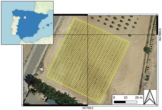 The study was conducted during the growing season of 2020 in an experimental vineyard (Figure 1) located in Zamadueñas estate (Valladolid, Spain; coordinates X:357700.6; Y: 4617774.6, ETRS89/UTM zone 30N, EPSG: 25830).