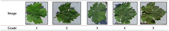Damage symptoms due to powdery mildew on leaf vine at different levels of infestation expressed on the percentage of leaf surface area affected: Grade 1 (no disease), Grade 2 (1–5%), Grade 3 (5–25%), Grade 4 (25–50%) and Grade 5 (>50%).
