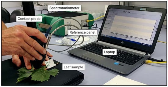 Spectra were obtained using a FieldSpec 4 spectroradiometer (Analytical Spectral Devices, Boulder, CO, USA). A contact probe with a tungsten halogen bulb was used to take leaf reflectance data (Figure 3), ensuring homogeneity in measurements. Three spectral measurements at different locations on each leaf were taken, and the damage level was assessed in order to obtain the spectral signature of detailed infestation levels. An average of 15 successive scans over the wavelength, ranging from 350 to 2500 nm, were done to calculate each spectrum of the leaf sample.