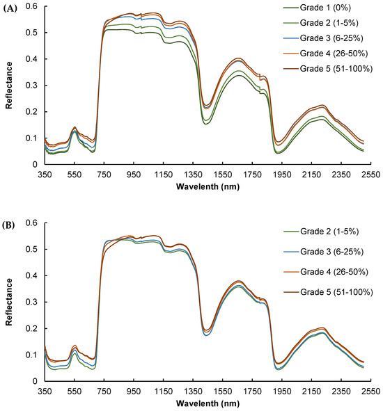 Mean reflectance spectra of leaves at different grades/levels of infestation by powdery mildew for (A) calibration dataset in July and (B) validation dataset in September.