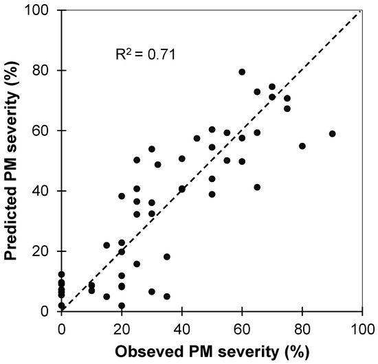 Observed versus predicted severity degree/levels of powdery mildew (PM) infestation derived from the PLS regression. These results correspond to the independent validation dataset. The dotted line is 1:1.