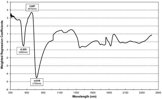 Figure 6 shows the Weighted Regression Coefficients of the PLS regression modes derived from the calibration dataset (10 July). Higher regression coefficients (Figure 6) are centred at 550 (green), 675nm (red) and 750 (red edge) nm, suggesting that the disease impacts chlorophyll assimilation [50]. Peaks at 1400 and 1900 nm highlight water metabolism disturbances due to powdery mildew.