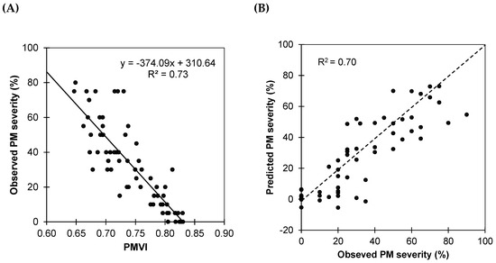 where R755 and R675 are reflectance at 755 and 675 nm, respectively. Reflectances R755 and R675 were calculated as average reflectances of ranges 740–770 nm and 660–690 nm, respectively. An ordinary linear regression analysis (OLS) using the PMVI as the predictor (Figure 7A) showed a significant correlation between PM severity and PMVI (R2 = 0.73), demonstrating the potential of the new index to detect disease severity in vineyards. The negative linear relationship between PMVI and observed severity indicates that as PMVI increases, the observed severity of infestation decreases.