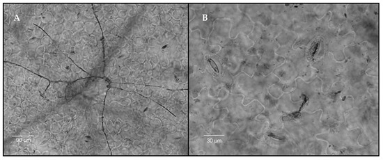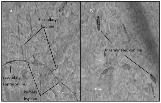For sampling, one leaflet of each leaf was randomly selected two days after inoculation, and the tip was cut out and processed for histological observations as described in [25]. In brief, two slices of the central area of each leaf were placed with the adaxial surface up on filter paper dipped in fixative (1:3, absolute ethanol/glacial acetic acid, v/v). The fixative was changed several times until the tissues were bleached; they were transferred to filter paper dipped in tap water for a minimum of 2 h and then moved again to filter paper in lactoglycerol (1:1:1, lactic acid/glycerol/water, v/v/v) for at least another 2 h. After this, the sample was carefully laid with the adaxial surface down on a cover glass on which a drop of trypan blue in lactoglycerol (0.1%, w/v) had been placed, and then it was mounted in lactoglycerol on a microscope slide. Then, at least 100 spores were counted per leaf at 20× magnification with a light microscope. Germination was recognized by the presence of at least a primary germ tube. To assess further development, 100 germinated sporelings were examined (when available), and the numbers of primary hyphae, secondary hyphae, and secondary appressoria were counted (Figure 1).
