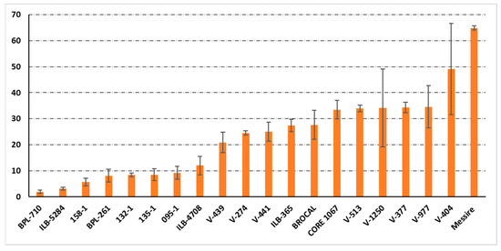 The first symptoms appeared 6–7 days after inoculation, and they were clearly visible on all plants 12 days after inoculation. A wide range of responses to infection by powdery mildew was found in the 19 genotypes of faba bean studied in the first experiment (Figure 2), with accessions BPL-710, ILB-5284, IC-158-1, 095-1, 135-1, BPL-261, and 132-1 appearing as the most resistant ones with CS < 10% and with V-404 as the most susceptible with a CS of 49.2% (V-404). Pea cv. Messire was even more susceptible with a CS of 64.9%.