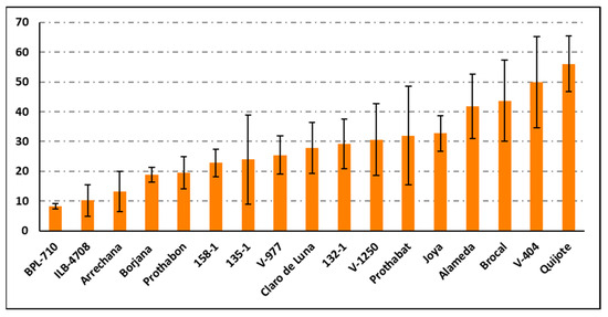 The results of the second experiment confirmed the resistance of BP-710 and ILB-4708 and the susceptibility of V-404 (Figure 3). A high variation in responses was also identified among the commercial cultivars, with cvs. Arrechana, Borjana, and Prothabon being the most resistant ones (CS < 20%) and Brocal and Quijote being the most susceptible (CS > 40%). As an example, the differences in the CS between BPL-710 and cv. Alameda are illustrated in Figure 4.