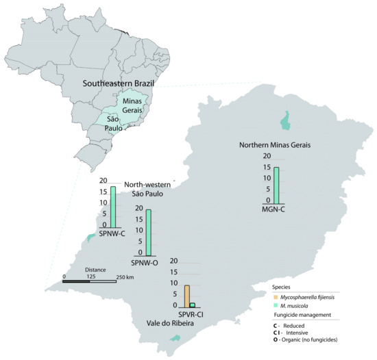 At the initial location in Vale do Ribeira, São Paulo (SPVR-CI), the management approach relied on intensive fungicide spraying, involving 8 to 14 preventive applications per year for the chemical control of black Sigatoka [7,8]. This region is renowned as the primary hub for banana production in São Paulo state and across Brazil. Here, the prevalent banana cultivars are the SDC-susceptible Prata (Musa spp. AAB, commonly known as “Lady Finger” banana) and Nanica (Musa spp. AAA, Cavendish subgroup) [6,7,14,54]. At the second site, situated in the northwest of São Paulo (SPNW-C), and the third site, located in northern Minas Gerais (MGN-C), fungicide usage is scaled down to four to five preventive sprays targeting Yellow Sigatoka [7]. The SPNW-C field covers an area of 40 hectares dedicated to the susceptible Maçã variety (triploid AAB) [7]. Conversely, in MGN-C, the banana plantation features Prata and Nanica varieties [7]. In the final sampled site (SPNW-O), no fungicides were applied. This area comprises several small family plantations with banana plants of diverse varieties and ages in Ilha Solteira county [7].