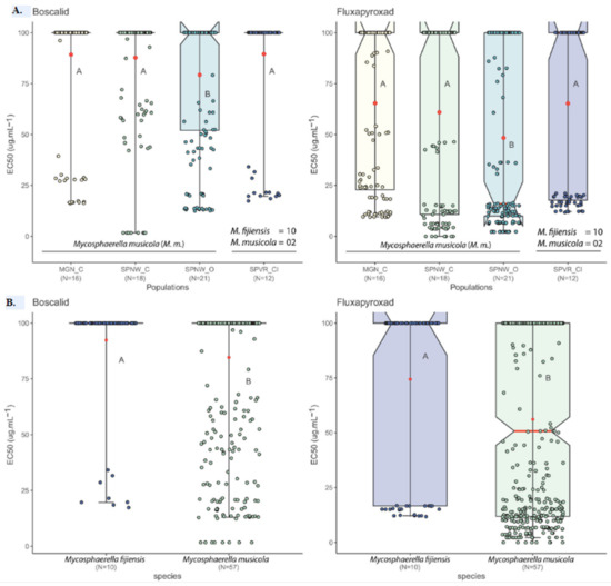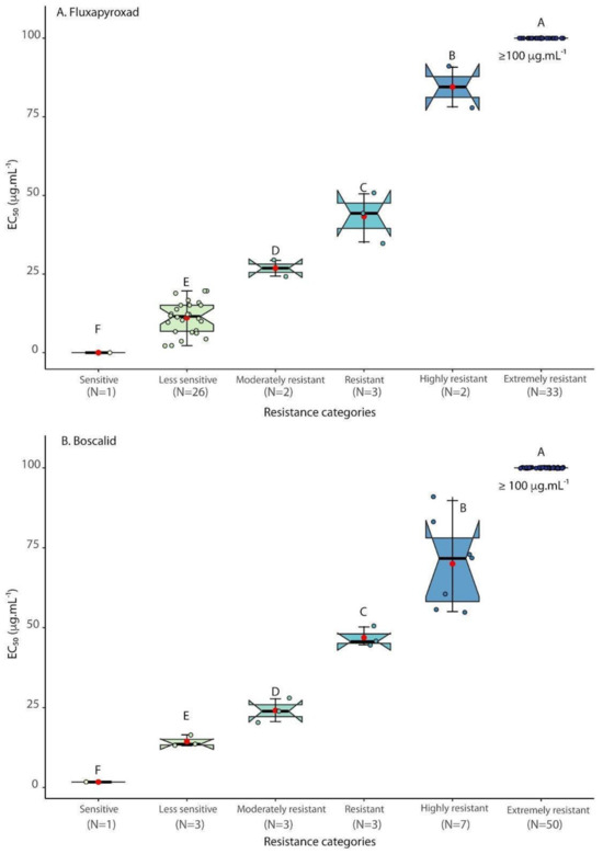 Average fluxapyroxad (A) and boscalid (B) sensitivities (EC50 values in μg mL−1) of M. fijiensis and M. musicola isolates and corresponding resistance categories. The F test from ANOVA, significant at p ≤ 0.001, assesses differences among groups of isolates from distinct resistance categories. Means, indicated by a red dot, followed by the same capital letter, are not significantly different by the Scott–Knott test at p ≤ 0.05.