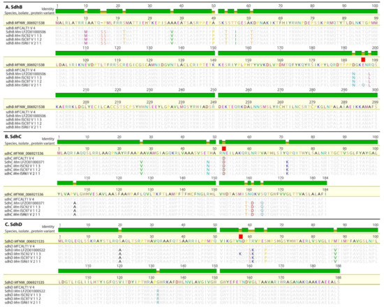 Interspecific comparison between the reference Sdh amino acid sequences of Mf and Mm showed a high similarity among the three subunits, with only 24 alterations (23 substitutions and 1 deletion) detected: 10 in the SdhB gene (deletion included), 8 in the SdhC, and 6 in the SdhD (Figure 4).