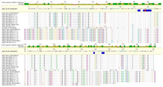 Alignment of amino acid sequences translated from the nucleotide sequences of the second SdhC paralog (SdhC2) of isolates ISR61 (Mm), ISC97 (Mm), ISR12 (Mm), MG17 (Mm), MG57 (Mm), ISC92 (Mm), and CALT1 (Mf) to identify nonsynonymous mutations by comparison with the SdhC and alt-SdhC/SdhC2 reference sequences.