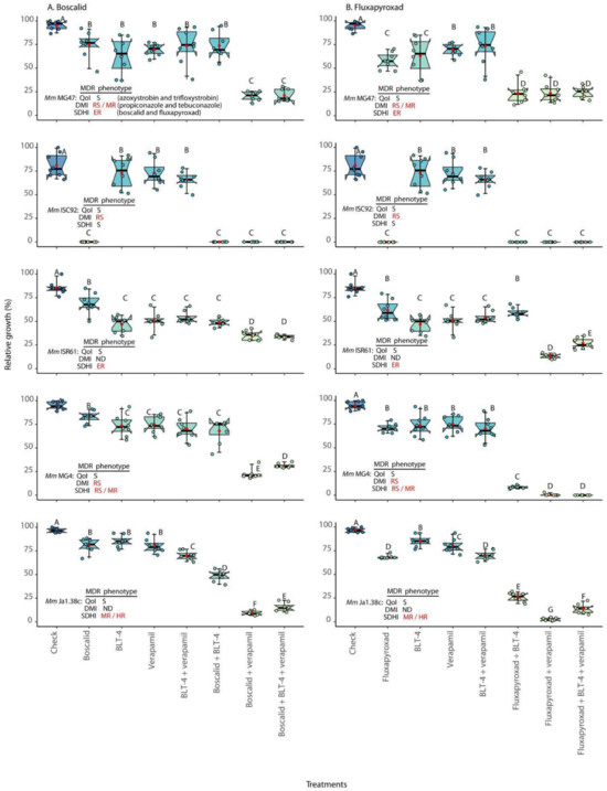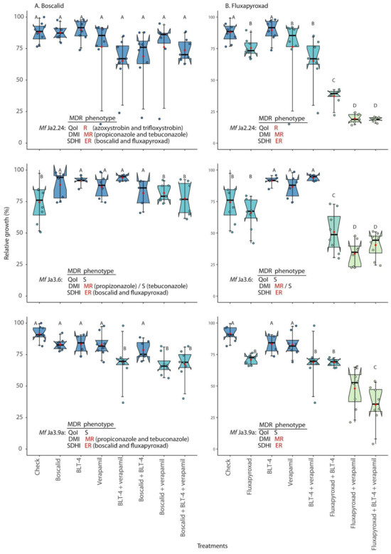 Impact of efflux pump transporter inhibitors BLT-4 and verapamil on reinstating sensitivity in multi-drug-resistant (MDR) isolates of Mycosphaerella musicola to boscalid and fluxapyroxad. The figure depicts boxplots with the medians represented by red lines across the notches, the average as red circles along the whisker lines, and the jittered data points in different colors to avoid data overplotting. The lower whisker covers all the data values from the minimum value up to quartile Q1, that is, the lowest 25% of data values. The upper whisker covers all the data values between quartile Q3 and the maximum value, that is, the highest 25% of data values. The F test from ANOVA was significant at p ≤ 0.001. Means followed by the same capital letter are not significantly different by the Scott-Knott test at p ≤ 0.05.