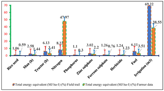 Different agricultural inputs’ energy shares (%) in the experimental field and the farmers’ fields.