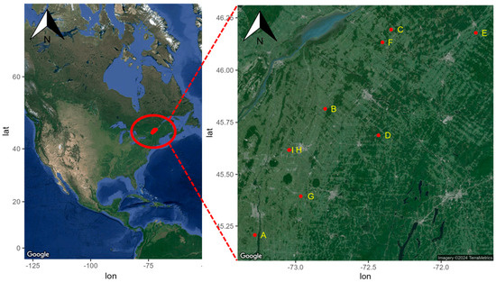 Location of the study sites (n = 9) in the province of Quebec, Canada. A red circle and a yellow letter denote each site.