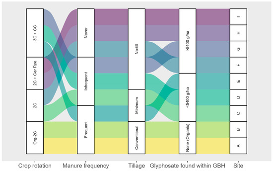 Classification of the nine sites based on crop rotation, frequency of manure application, soil tillage and cumulative GBH application between 2017 and 2020. Acronyms: Org-2c: organic system with maize and soybean (M-S); 2C: conventional system M-S; 3C + CC: conventional system M-S-Wheat and cover crops (cereal, radish, peas) after wheat harvest; 2C + Cer Rye: conventional system with M-S with cover crop (cereal rye) after every crop harvest.