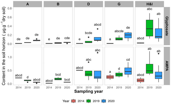 Glyphosate and AMPA soil contents at producers’ fields that were part of both this experiment in 2019 and 2020 and of that of Maccario et al. [23]’s study in 2014. Soils were sampled at 0–20 cm depth. Letters represent post-hoc analysis for each molecule using Tukey adjustment.