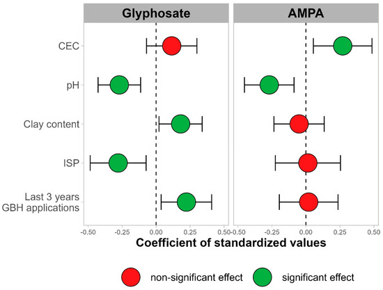 When excluding organic sites from the multiple regressions, the adjusted R-squared values of the regressions are 50% for glyphosate and 19% for AMPA. Soil pH shows a significant negative effect on glyphosate (p < 0.01) and AMPA (p < 0.01) contents. Soil clay contents show a positive effect on glyphosate contents (p = 0.03) but not on AMPA contents (p = 0.59). Soil CEC has no significant effect on glyphosate (p = 0.22), but a significant positive effect on AMPA contents (p = 0.02). Soil ISP has a significant negative effect on glyphosate contents (p = 0.01) but not on AMPA contents (p = 0.91).