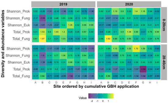 Cumulative GBH applications and cropping management have a small effect on the diversity and richness of microbial communities. Prokaryotic and fungal community Shannon diversity is not significantly impacted by cumulative GBH applications (p > 0.27) and crop rotations (p > 0.05). GBH applications significantly impact eukaryotic diversity (p = 0.02), with higher eukaryotic diversity in fields receiving GBH applications. Cumulative GBH applications and crop rotations do not impact prokaryotic and fungal quantification.