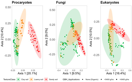 Principal coordinate analysis of prokaryotic (left), fungal (middle), and eukaryotic (right) communities. Point colors represent the groups based on GBH cumulative applications between 2017 and 2020. Point shapes and ellipses colors represent soil texture. Ellipses signification threshold was 0.05.