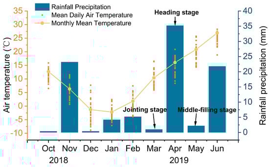 During the 2018–2019 period, experimental materials were cultivated at the Hancun Experimental Station of the Wheat Research Institute, Shanxi Agricultural University, Shanxi Province, China, situated at an elevation of 459.00 m (111°34′36″ E, 36°8′43″ N). Located within the North China Plain, the site is characterized by a typical temperate continental semi-arid climate, receiving an average annual rainfall of 457.71 mm and maintaining an average annual temperature of 13.08 °C. The total rainfall during the wheat growing season (October 2018 to June 2019) was 93.6 mm, rainfall from the tillering to the jointing stages (November 2018 to March 2019) amounted to 34.0 mm, from jointing to heading stages (March 2019 to April 2019) was 35.2 mm, and from filling to maturity stages (May 2019 to June 2019) totaled 24.0 mm (Figure 1). The soil type is calcareous brown soil, pH 8.78, with organic matter content of 18.70 g·kg−1, total nitrogen content of 1.06 g·kg−1, available nitrogen content of 44.61 mg·kg−1, available phosphorus content of 6.78 mg·kg−1, and available potassium content of 128.02 mg·kg−1.