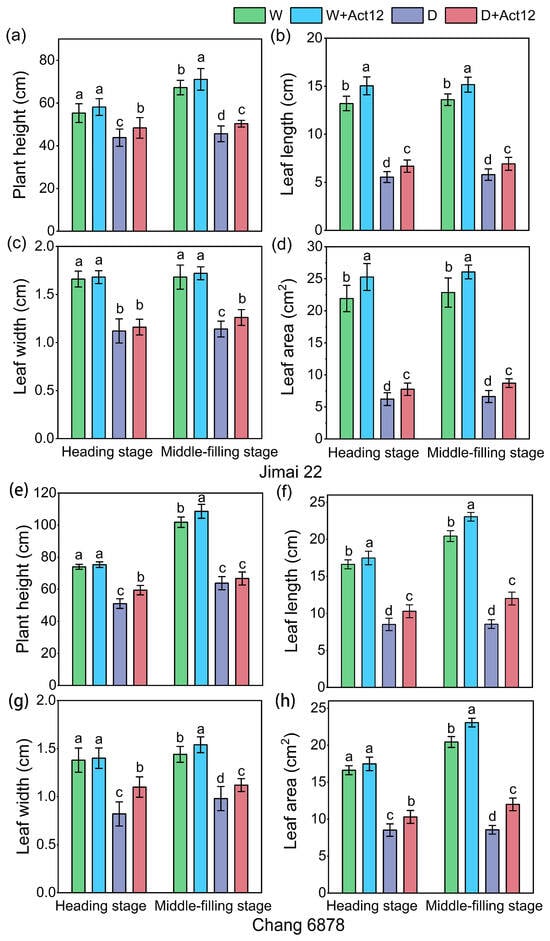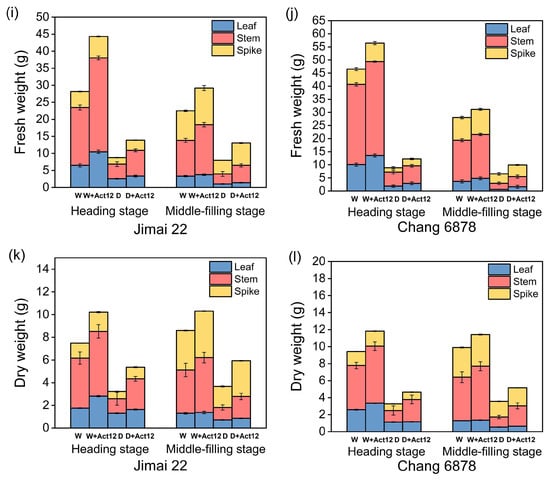 Effects of Act12 inoculation on plant height (a,e), leaf length (b,f), leaf width (c,g), leaf area (d,h), fresh weight of leaves, stems, and spikes (i,j), and dry weight of leaves, stems, and spikes (k,l) in two wheat varieties ((a–d,i,k) Jimai 22; (e–h,j,l) Chang 6878) at the heading and middle-filling stages under different water conditions. Data are presented as mean ± standard deviation (SD) with n = 5. Statistically significant differences are denoted by distinct alphabetical letters (p < 0.05).