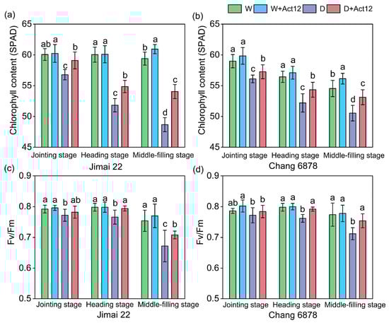 Effects of Act12 inoculation on leaf chlorophyll content (a,b) and photosynthetic efficiency (Fv/Fm) (c,d) in two wheat varieties ((a,c) Jimai 22; (b,d) Chang 6878) across jointing, heading, and middle-filling stages under different water conditions. Data are presented as mean ± standard deviation (SD) with n = 5. Statistically significant differences are denoted by distinct alphabetical letters (p < 0.05).
