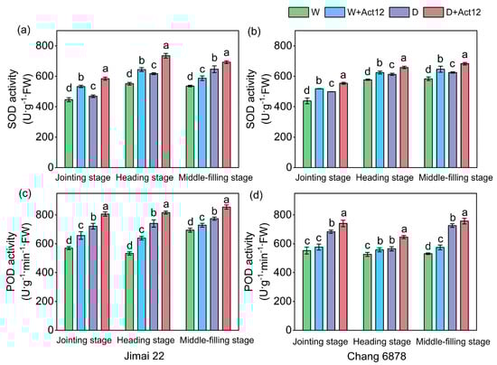 Effects of Act12 inoculation on the activities of antioxidant enzymes SOD (a,b) and POD (c,d) in two wheat varieties ((a,c) Jimai 22; (b,d) Chang 6878) across jointing, heading, and middle-filling stages under different water conditions. Data are presented as mean ± standard deviation (SD) with n = 3. Statistically significant differences are denoted by distinct alphabetical letters (p < 0.05).
