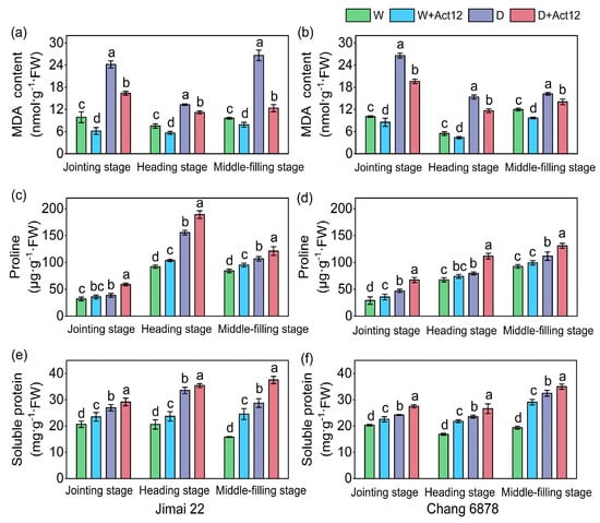Effects of Act12 inoculation on MDA (a,b), proline (c,d), and soluble protein (e,f) content in two wheat varieties ((a,c,e) Jimai 22; (b,d,f) Chang 6878) across jointing, heading, and middle-filling stages under different water conditions. Data are presented as mean ± standard deviation (SD) with n = 3. Statistically significant differences are denoted by distinct alphabetical letters (p < 0.05).
